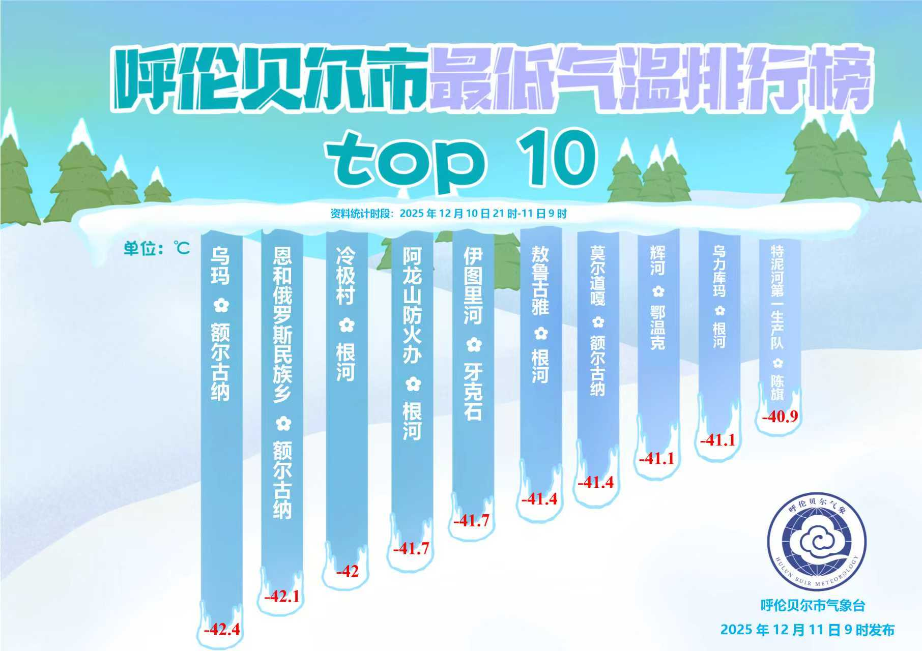 额尔古纳市的乌玛以-42.4℃夺得本次“低温接力赛”冠军,呼伦贝尔再次开启“速冻模式”。