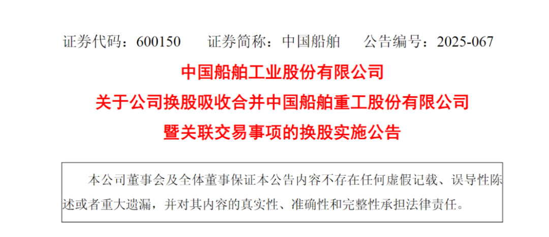 此外,中国船舶将在本次吸收合并换股实施完成后另行刊登换股实施结果、股份变动暨新增股份上市的公告。投资者需及时留意公告信息。